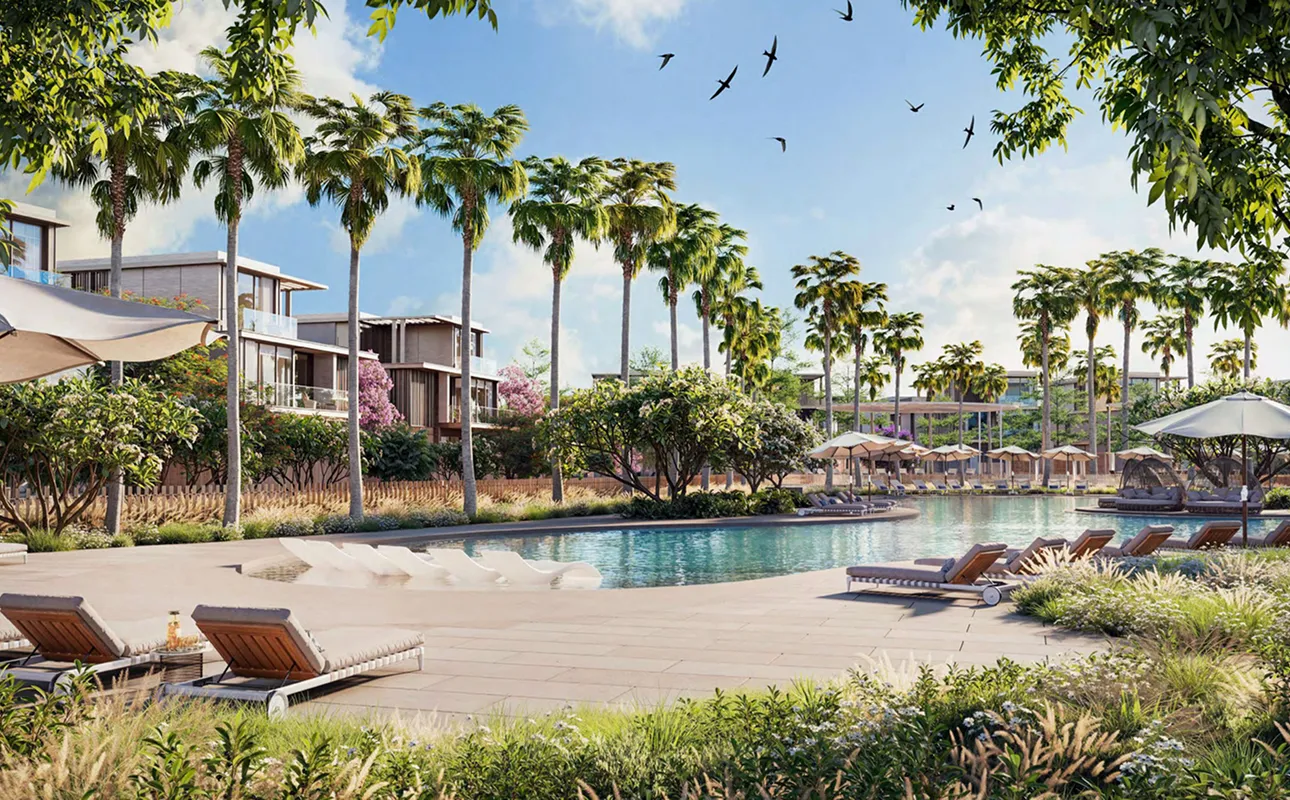 A resort-inspired pool surrounded by greenery, offering a relaxed setting for families and everyday leisure.